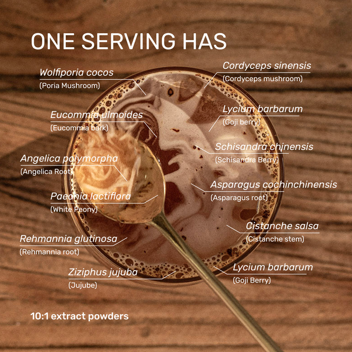 Tonic herbs such as the Cordyceps Mushroom, Eucommia Bark, and Cistanche Stem work to restore that essence, allowing for renewed groundedness, flow, and inner power.