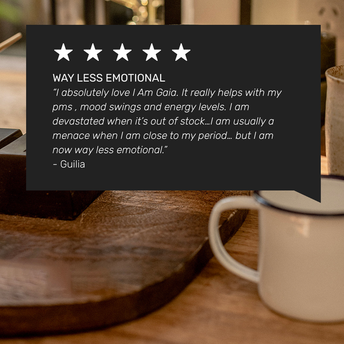 “I absolutely love I Am Gaia. It really helps with my pms , mood swings and energy levels. I am devastated when it’s out of stock…I am usually a menace when I am close to my period… but I am now way less emotional.”